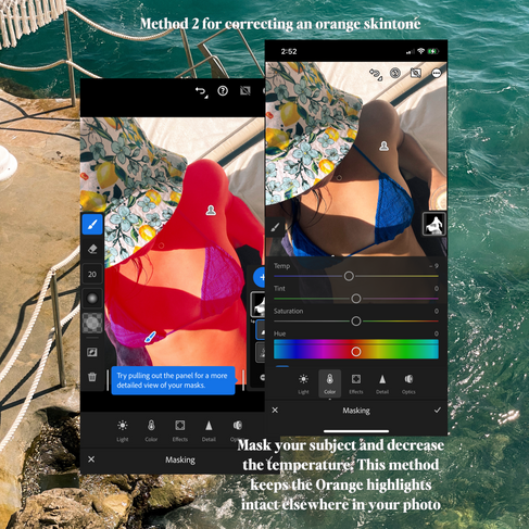 Masking your subject and decreasing the temperature will reduce the orange skin tones while preserving the warmth in the rest of the photo. This method is my favourite as I can precisely target the subjects skin without changing the warmth and temperature of the rest of the photo.